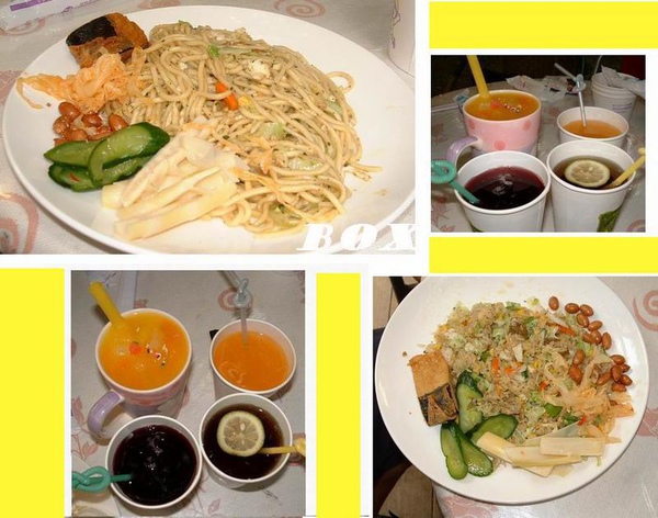經過一早的奔波,午餐時刻已過,一家人早累得餓扁了,不過還是有品嚐這裡的餐點,我們不是那種餓過頭,吃啥都說好吃的人,所以關於這裡的餐跟下午茶的評語則是普通,唯一的特點就是素食,讓你的腸胃沒有負擔,這裡的供餐也簡單不過,什錦炒飯跟百燴炒麵,利用高麗菜跟松茸食材炒出來的,其他的食材就如圖片所見,都是一樣的配菜,花生、素雞、醃小黃瓜、筍絲、高麗泡菜,每客是250元。這裡的下午茶每客是220元,可以點選喜歡的飲料與茶點,女兒點的是烤厚片吐司加上芒果冰沙,厚片吐司標價80元,芒果冰沙160元,這樣省下40元,其實似乎與一般咖啡屋的標價差不多,若與早餐店比較就貴多了,所以在美麗的風景下,享受午後的優閒,代價似乎不小。不過不一定要點選下午茶點,你也可以單點咖啡或一壺花茶,靜靜的享受郊外片刻的優閒。