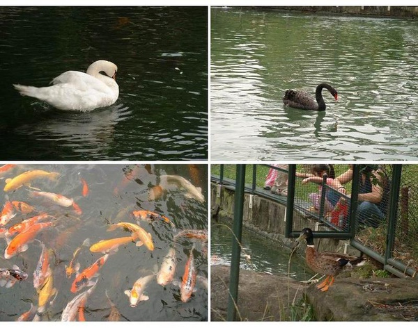 池塘除了魚,還多了幾隻白天鵝、黑天鵝、綠頭鴨…。哦!還有一隻白色的鴨子,有點突兀的畫面。因為白鴨子總是跟著綠頭鴨們和在一起,綠頭鴨慢慢的、悠閒的悠游池中,白鴨子像是糾察隊似的,不准它們太怠慢,總是「ㄚ!ㄚ!」的亂叫,然後快速的游著、追著綠頭鴨們。好玩的是,綠頭鴨似乎也不太反感,還是依然故我的慢慢悠遊。急驚風與慢郎中,正好形容它們的相處模式,真的很有趣。