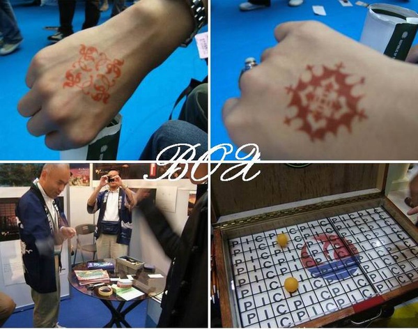 由於是國際級的展覽,每個國家攤位除了派出當地的人員駐點講解外,更有好玩的遊戲與獎品可拿。換個方式說,就是想拿獎品得玩猜題或是玩過關遊戲才行。既來之則安之的心態,我跟凱莉玩了幾樣。到日本攤位想拿地鐵的模型就得玩猜拳,這關我們倆各都通過,因為我們贏了關主。到了關島則是拿乒乓球丟擲於箱子的框線內,如果三顆球落在英文字母的P.I.C就有紀念筆可帶回家,可惜我們都丟不準!