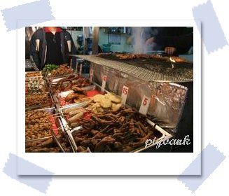 而且在這之前,又買了不少燒烤的食物。大大的烤肉架真是夠豪氣,似乎在這裡才能見到。只要將你要的食物放置烤肉架前端,老闆就知道這是客人點的,然後依照客人需要的口味,加辣與否,置上烤肉架,不一會兒就可享用。烤肉醬可不用刷,看老闆直接把要烤的食物,浸泡醬汁就上烤架,真是特別。