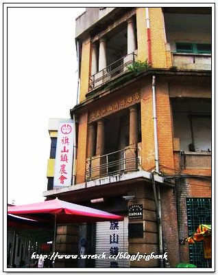 臨走前我拍下旗山鎮農會,農會創於民國三十五年,三層式磚造洋樓,正面立二方柱,柱身洗石子打格;二、三樓則立柱設廊道,柱身為洗石子,側面貼淺色面磚裝飾,算是旗山鎮古老建築的地標。我拍下回來觀看,發覺三樓外廊屋簷有築巢的燕窩,多的讓人訝異。我想這肯定是個有福氣的好地方,才能讓燕子也樂於在此棲息。