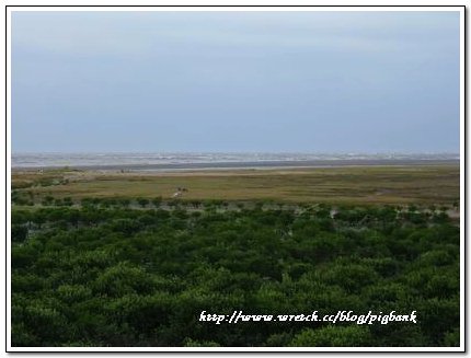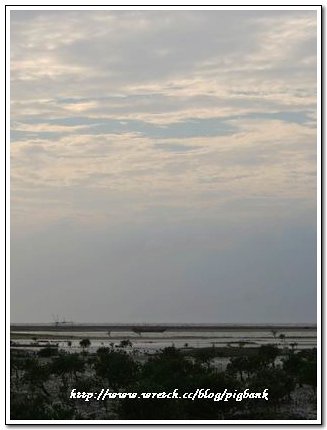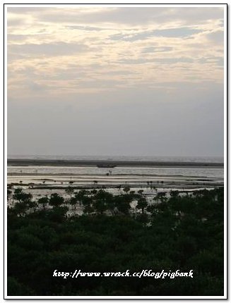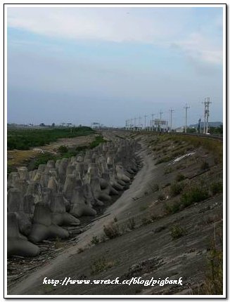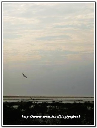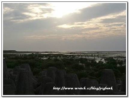 那女子就是在下我,一家四口跟著攀爬著,行徑看似好笑,但卻是最能接近溼地的另一種方式。我停留在消波塊上,勉強的倚靠消波塊坐下,時而看鳥兒飛翔,時而看雲彩奔跑,感覺真是愜意。