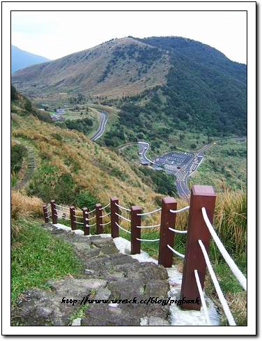 將車子停放冷水坑,平常總是從這裡走到擎天崗,這次換個方式,往回走打算走到七星山的景觀亭,從高處往下鳥瞰肯定別有特色。雨時有時無,風勢卻是一點也不小,呼呼作響。陡峭的階梯,看似簡單,走來卻是膽顫心驚,深怕一個不留神,馬上從山上滾落山下,若是晴天造訪肯定沒這麼驚險刺激。