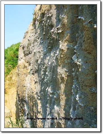 非假日的午後,我跟先生從白沙屯車站開始,循著鐵道往北走。鐵道旁的小路寂靜,除了維修的工人外,這裡好像沒人會來似的。靠著網路解說的小抄,找尋關於貝殼山的蹤影。「過港貝化石層紀念碑」不知在哪,只在一座路旁的小山看見貝殼化石山的蹤跡,這貝殼山似乎有被挖土機刻意的挖採,露出一排排赤裸裸的貝類化石,整座山滿佈化石的景象,若非親眼所見,很難想像這裡曾經是海底的一部分。