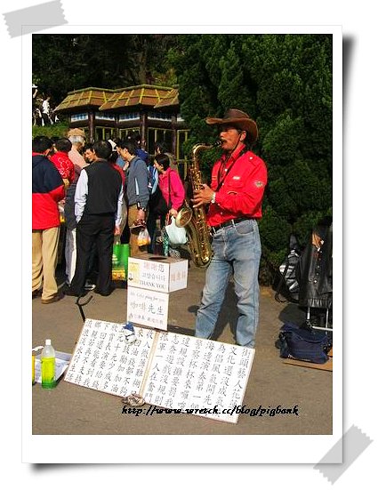 本來不想走到花鐘,知道滿滿的人潮肯定擁擠,但是不到此處,無法見到吉野櫻的美麗。處處皆是人潮,巧得是我見到熟悉的身影,咖啡先生也在這裡表演。於是我拍完照,特地上前去跟他介紹自己是「盒子」,算是網路上知悉此人的第一次見面。他拿起放在小箱子的紙鎮,一個花蓮特產的礦石給我當禮物。簡單的閒聊,知悉因花季在陽明山花鐘前表演,平時則在淡水捷運後頭演出,看他一切都好,內心感覺欣慰。我替他拍了幾張照片後告別,感謝他告知我如何避開擁擠車潮快速到家,不然昨日的下山肯定又是噩夢連連。