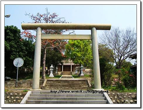 左晃、右晃,憑著感覺,我們還是找到神社。神社的後方還有櫻花與杜鵑的身影,感覺幽靜美麗。目前神社保留舊有的鳥居、參拜道、石燈籠、拜殿、本殿基座、社務所、宿舍。至於應有的幣殿、本殿、手洗台,因為人為因素遭到破壞,連附屬建物都被民間佔住使用。