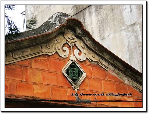 屋外有三隻狗,看到外人狂吠不已,要他們閉嘴肯定不可能。倒希望他們的狂吠讓主人注意,或許還能請求進入看個仔細。不過看來我想多了,狗兒大概知道我不輕易離開,他們叫累了乾脆休息,而我依舊只能在門外往院子裡頭窺探。屋頂已經翻修成鐵皮瓦,彩繪也有重上漆的跡象,不過從屋外的磚牆建材,山牆的泥塑雕花,屋樑上頭的彩繪色彩,就能得知這宅第當初的繁華,乃富貴人家。