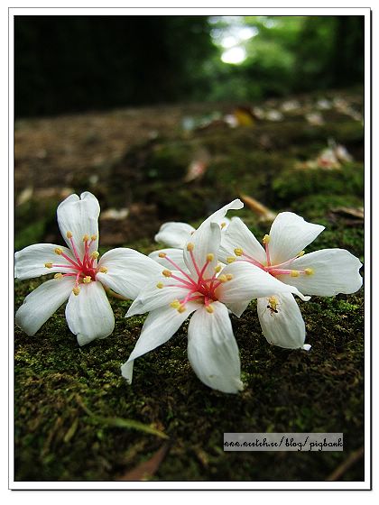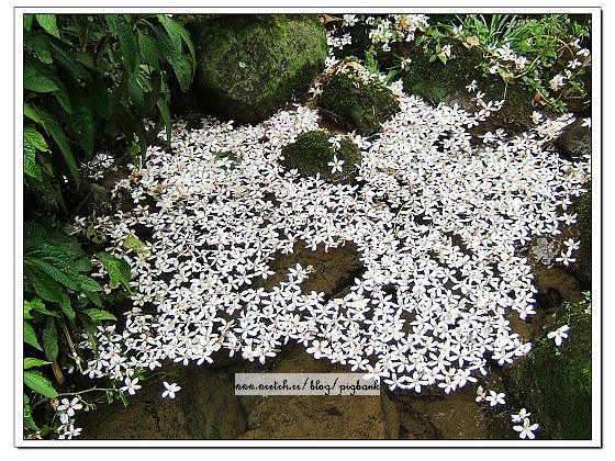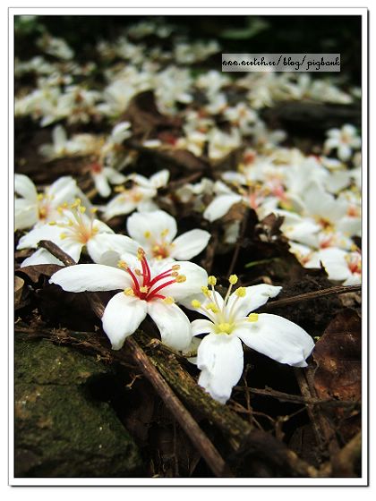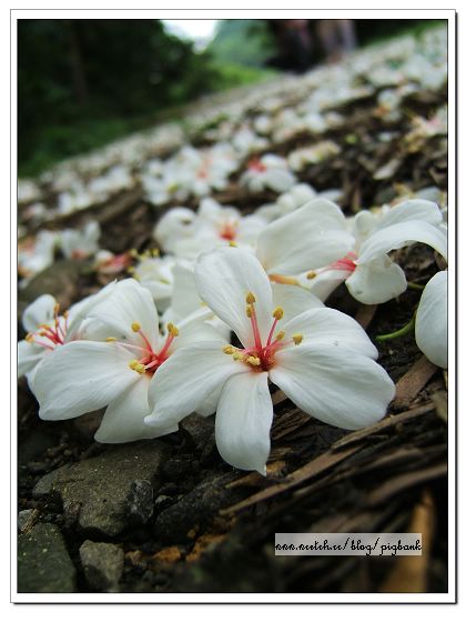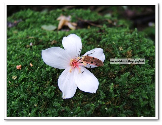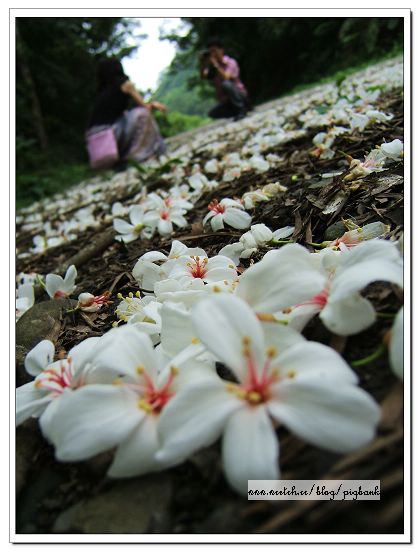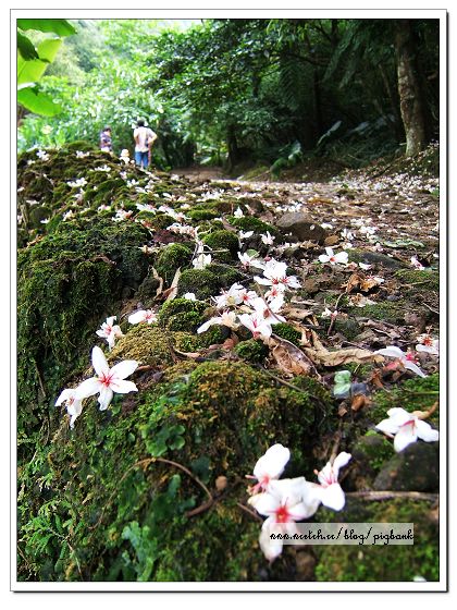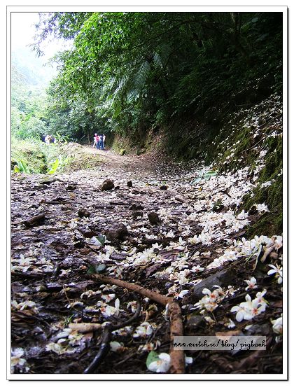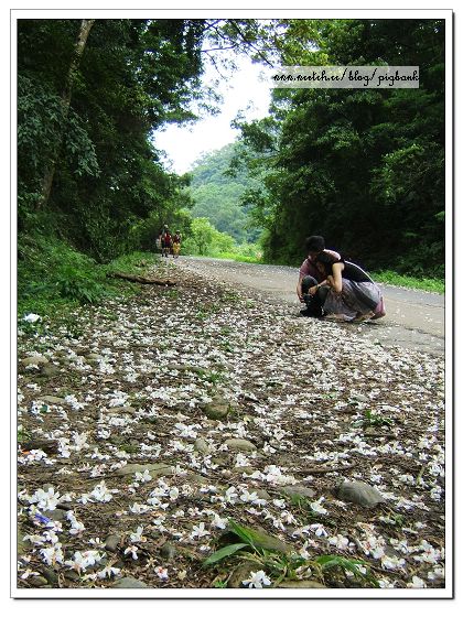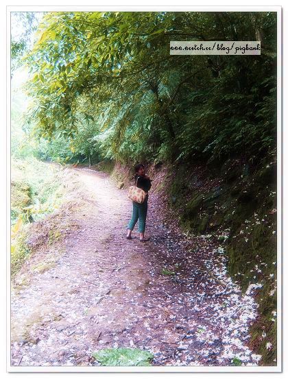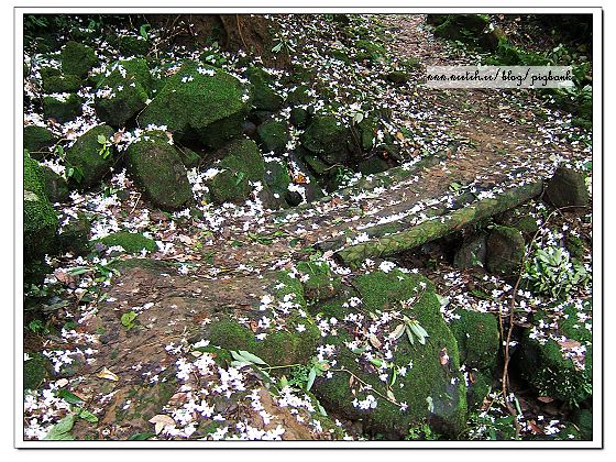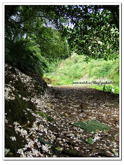 那種感覺並沒讓初次賞桐花的Anny失望,雖然剛進古道就遇見小蛇,兒子還一直催促我拍下它的”可愛”身影,想想還是不宜貼上網誌。步行不到5分鐘,眼前就有一處落花,更往裡走,更是驚艷處處,愛拍照的我們,光是一處就耗費10幾分鐘,更別說是遇上滿滿的山徑桐花,一拍、再拍,路人都不知經過幾批,我們還是逗留原處,拍到過癮才前進。