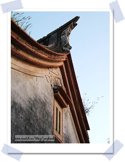屋脊燕尾的美麗歸功匠師巧手,或許燕尾與脊鎖大同小異,可是脊塞處可就不同。有的雕飾為獅子、有的為鯉魚,搭配山牆泥飾圖案,更顯得古宅的美麗,一次看盡浯州的建築,該說不虛此行吧!