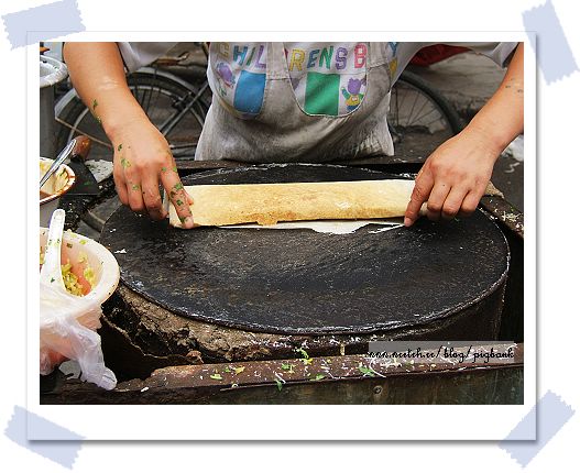 幾天的大陸行,早餐常是小餛飩打發。看到眼前包脆餅小販,真感謝老天爺,好懷念這樣的味道。大陸的餛飩沒台灣來的好吃,肉末少得可憐,湯頭又常過鹹,有點食不下嚥。雖然不確定眼前的薄餅是否獲得青睞,至少口味有了變化。