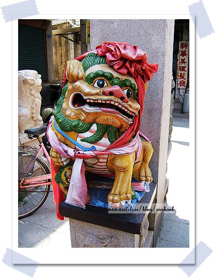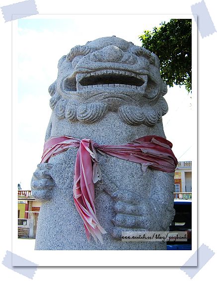 [邱良功節孝坊前的獅王,聽說她曾經顯靈過,於是封為獅王,地方人士將其戴彩帶,並拜拜油漆]