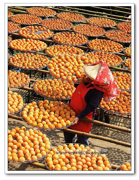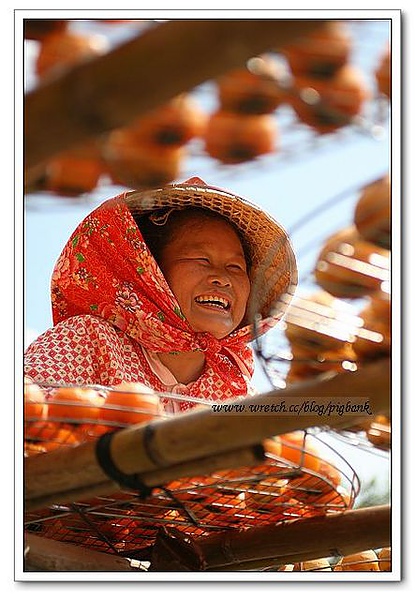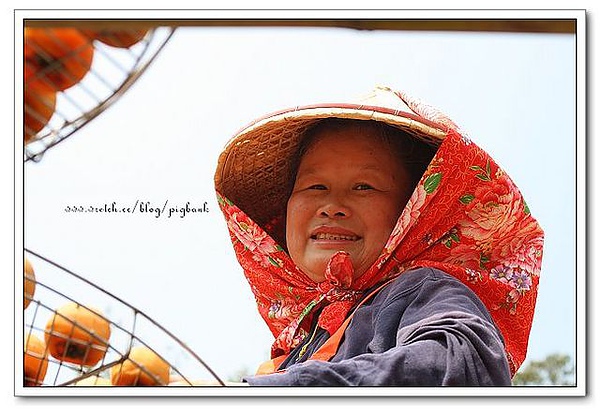 「妳來遲囉!快點上去,我要端柿子了,若要拍整個場景,妳動作得快點!」老實說剛開始摸不著頭緒,不過眼前有模特兒供拍照,說什麼我都得跟上。「妳跟他們一起來的嗎?」眼前有四、五位拿著單眼相機的旅人,我搖搖頭說:「不是耶!」「那你要拍照嗎?」她善意的問我。當然好囉!我猛點頭,她告訴我如何上到頂端,拍下一張張豐收的場景。