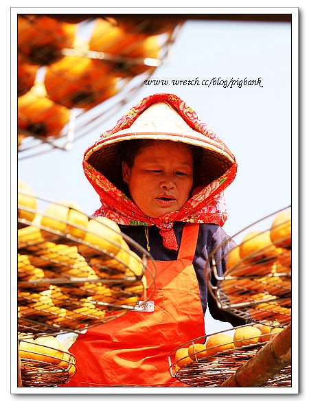 透過曝曬柿子的竹竿架,我拍到一張張快樂自在的神情,雖然大姐只是假日的果園義工,可是卻是最佳的柿餅代言人。每年的柿餅季,總是會在電視或是報章雜誌上頭看到她的身影,這是我的初次拜訪,在黃澄澄的柿餅中,發現那張張甜美的笑容。[2006.10.06]