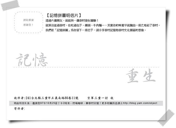 索取者請自己保留一張,另外五張分享給同學、同事或朋友,然後在明信片上填妥寄件人的地址、名字、貼上郵票、投遞郵筒,寄回空軍眷村。當然!自己的那張也要寄出,而後眷村文化協會會將各位寄回的六張明信片拼成一組完整影像,用兩片透明壓克力板夾住展示。(無法想像透過大家的傳遞,最遠是從哪裡寄出的?)寄出者可於10月25日當天到空軍三重一村參加聚會,大家可以來喝茶、看眷村影像展,一起認識這裡。(沒寄明信片也可以參加唷!)