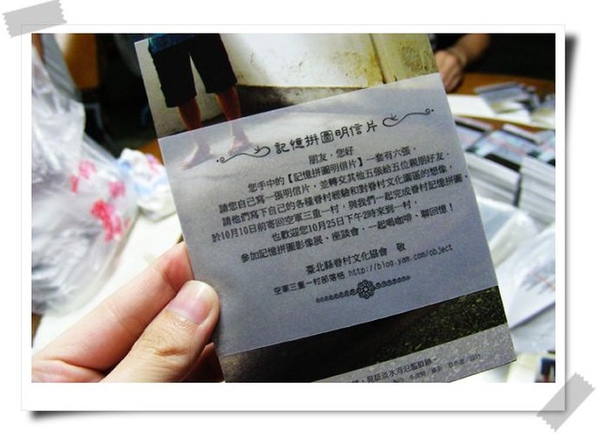 我不是眷村的孩子,也不是眷村後援會一員,但對於文史傳承工作,若有餘力,我願意幫助。可以邀請看到此篇的你(妳)來參與嗎?若可請留下您的通訊地址,不是無名的會員想參與者請寫MAIL給我,將於近日將成套的明信片寄送到您的手中。