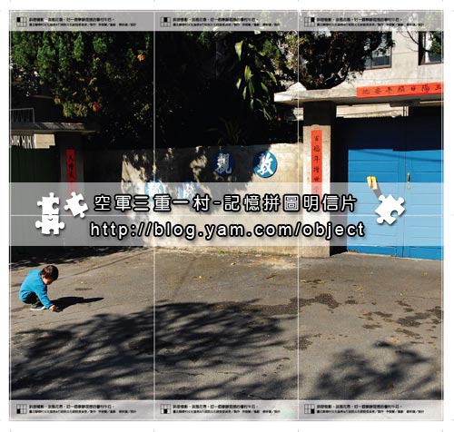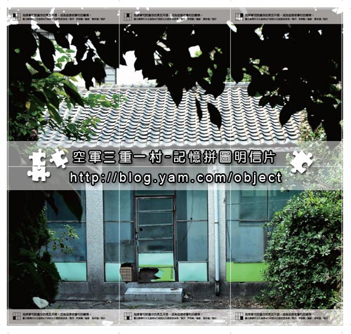 說起「空軍三重一村」知道的人還是不多,它是目前台北縣唯一眷村歷史建築,但是公告成為古蹟,並不表示它會有人維護,也不表示會持續維持原貌,畢竟政府撥下的經費是有限的。在整體搬遷淨空之際,為了讓更多人知道這裡,眷村文化協會舉辦一個「記憶拼圖明信片」的活動,邀請喜歡文史與古蹟、影像記錄者一同來參與。藉由傳遞明信片的同時,分享空軍三重一村的訊息,也想喚起大家對於文化傳承、維護的觀念,讓它能因為大家的注意而安穩的存在。